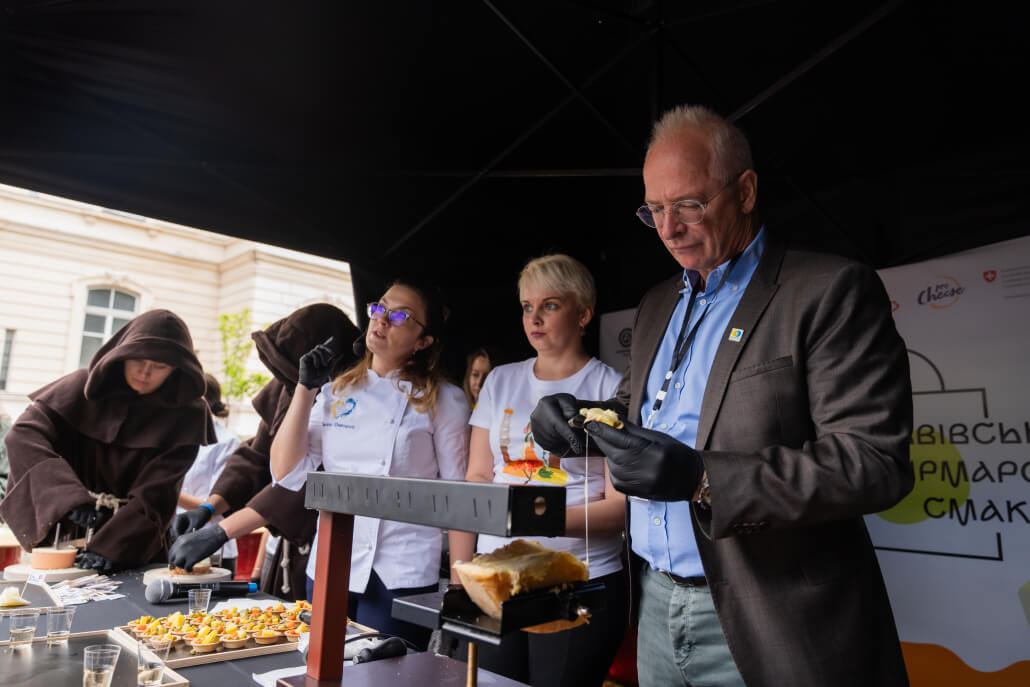 Андреас Хубер, директор Програми співробітництва Посольства Швейцарії в Україні, під час ярмарку провів майстер-клас з приготування раклету. Відвідувачі не лише дізналися історію та традиції споживання цієї страви, а й багато секретів про те, як зробити консистенцію сиру ідеально ніжною, тягучою та досягти того самого швейцарського смаку.