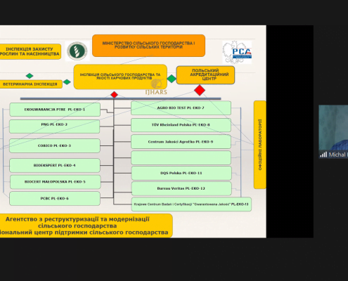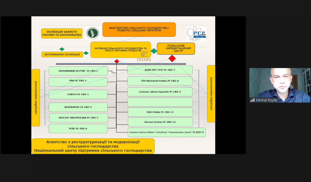 Про органічний сектор Польщі, зокрема законодавство, план дій щодо органічного виробництва, мету органічного виробництва, важливість контролю держави в органічному секторі та державну підтримку доповідав Міхал Житкі, незалежний експерт, радник директора Польського центру акредитації. У своїй доповіді він також детально зупинився на структурі системи контролю та ролі державних установ в органічному секторі.
