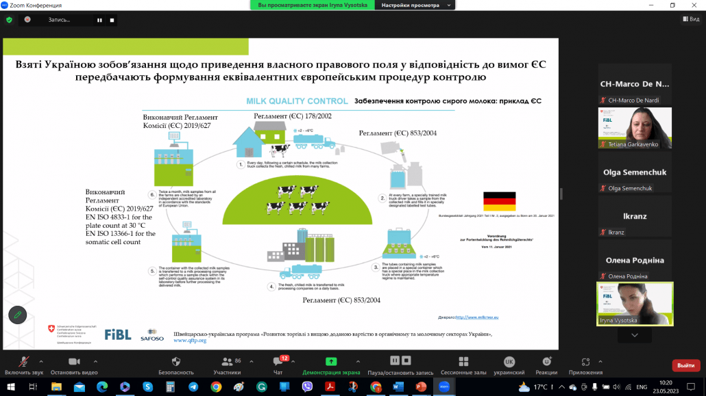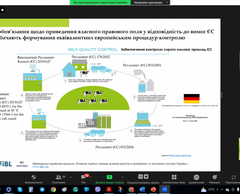 Ірина Висоцька зосередилася в своїй презентації на двох аспектах: законодавчих, оскільки кожен учасник Програми контролю сирого молока повинен розуміти законодавчі рамки її впровадження, та на інтерпретації результатів лабораторних досліджень відповідно до встановлених вимог.