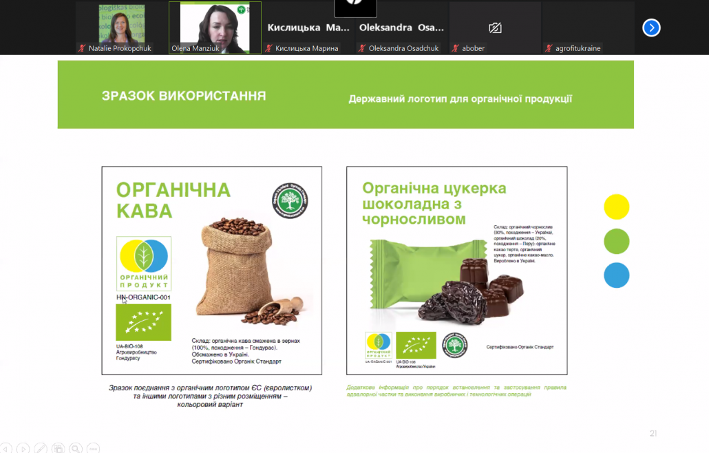 Головною метою тренінгу було навчання операторів, громадських організацій та надавачів послуг в органічному секторі України щодо вимог та правильного використання державного логотипу для органічної продукції та маркування загалом. Більше 130 учасників тренінгу, який відбувся онлайн, мали змогу докладно ознайомитися із Законодавством України у сфері органічного виробництва, обігу та маркування органічної продукції, а саме наказом Міністерства аграрної політики та продовольства України «Про затвердження державного логотипа для органічної продукції.