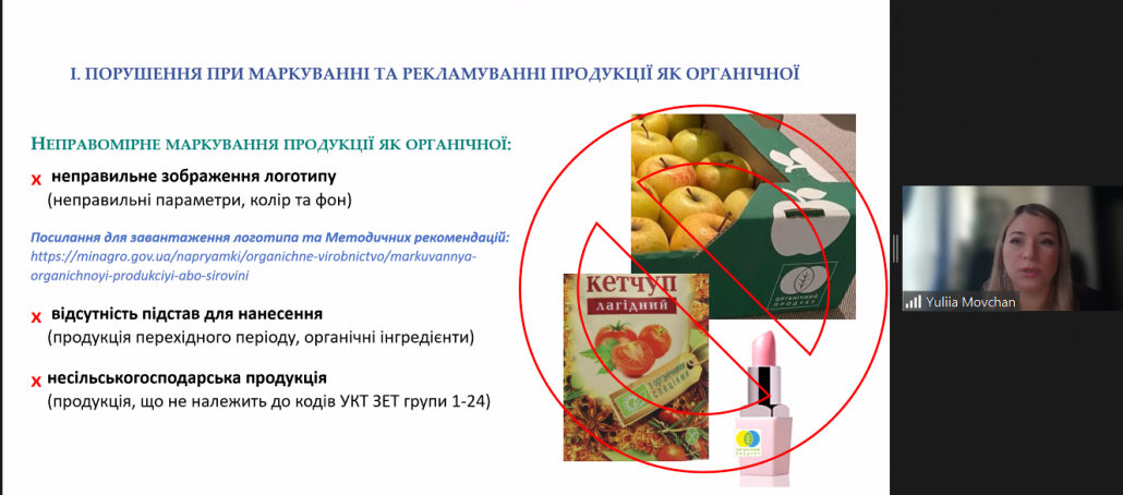 Про юридичні аспекти та відповідальність за порушення законодавства у сфері органічного виробництва та неправильного використання державного логотипу учасники дізналися від Юлії Мовчан, експертки із законотворчості та юристки-розробниці органічного законодавства України, к.ю.н., с.н.с. Знаннями про практичні аспекти та правила маркування органічної продукції відповідно до законодавства України ділилася Олена Манзюк, заступниця керівника відділу сертифікації, стандартизації та якості органу сертифікації «Органік Стандарт».
