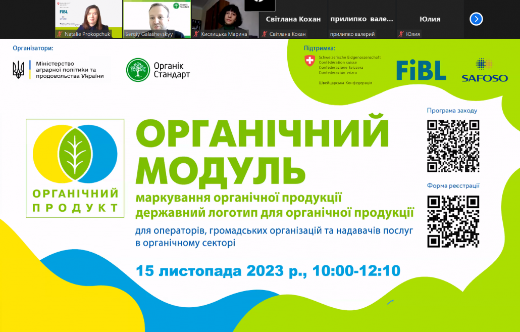 15 листопада 2023 року відбувся навчальний тренінг «Органічний модуль (UA). Маркування органічної продукції. Державний логотип для органічної продукції». Захід організовано за ініціативи Міністерства аграрної політики та продовольства України спільно з органом сертифікації «Органік Стандарт» та за підтримки Швейцарії.