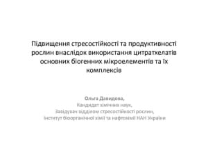 Ольга Давидова (інститут біоорганічної хімії та нафтохімії НАН України), Підвищення стресостійкості та продуктивності рослин внаслідок використання цитратхелатів основних біогенних мікроелементів та їх комплексів |