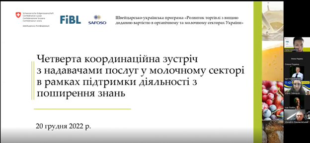 20 грудня 2022 року було проведено вже четверту координаційну зустріч надавачів послуг в молочному секторі в Україні. У заході взяли участь близько 30 учасників, серед яких були представники секторальних асоціацій, консультаційних центрів, дорадчих служб, приватних консультантів тощо.