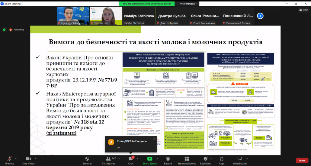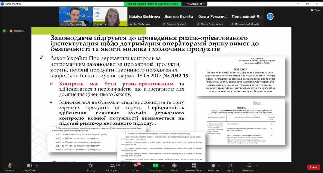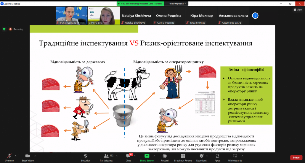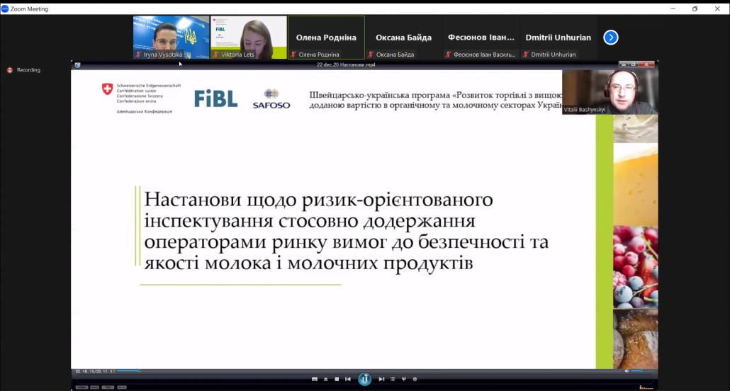 21 грудня 2022 року відбувся онлайн тренінг присвячений темі «Ризик-орієнтоване інспектування операторів ринку молока і молочних продуктів». До заходу долучилися близько 400 учасників, серед яких були представники Мінагрополітики, центрального апарату Держпродспоживслужби, фахівці ГУ Держпродспоживслужби та уповноважені ветеринари зі всієї України. Така кількість учасників свідчить про важливість даної теми, оскільки впровадження ефективної системи контролю сприятиме виробництву та обігу безпечних молочних продуктів.